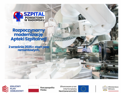 2 września 2025 r. rozpoczną się prace remontowe w Aptece Szpitalnej Szpitala Powiatowego w Radomsku w ramach inwestycji pn. „Modernizacja Apteki w Szpitalu Powiatowym w Radomsku”. Celem modernizacji jest stworzenie jednej z najnowocześniejszych aptek szpitalnych w Polsce, wyposażonej w zaawansowane technologie wspierające przygotowywanie i wydawanie leków. Nowoczesne technologie w aptece Kluczowym elementem modernizacji będzie robotyczny…